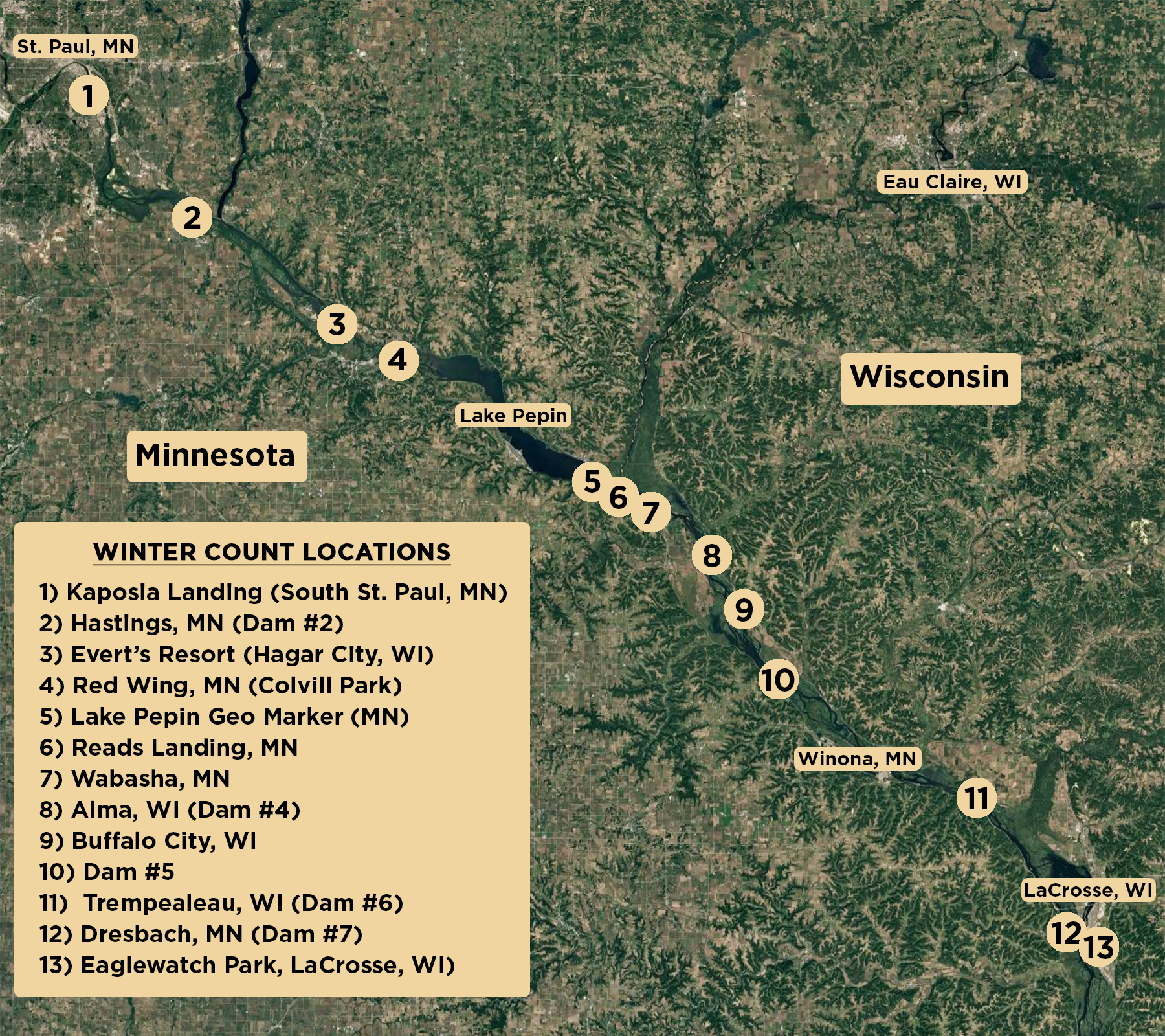 Our winter Bald Eagle counts are conducted weekly by our staff and volunteers at eight locations around the Wabasha, MN area of the Upper Mississippi River. They are not scientific in nature, but rather snapshots in time to help us gauge winter Bald Eagle activity in and around the Wabasha area. Our goal is to monitor eagle activity and provide a resource to tourists, photographers, and birding enthusiasts to aid their eagle viewing during the winter months when viewing is the best.